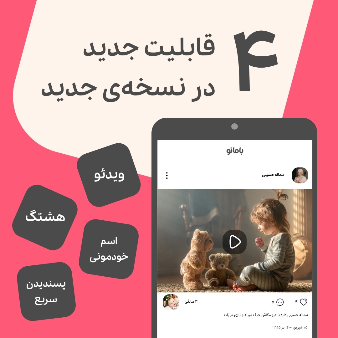 تو نسخه جدید بامانو، کلی قابلیت جدید داریم! امکان آپلود ویدیو تا یک دقیقه، امکان استفاده از تگها در پست، امکان تخصیص و نمایش اسم مستعار در آلبوم، بهبود عملکرد پسندیدن و امکان استفاده از دابل تپ برای لایک کردن، امکاناتی هستند که در این نسخه به بامانو اضافه شدند. چند تا مشکل جزئی رو هم رفع کردیم و عملکرد کلی اپلیکیشن رو هم کمی بهبود دادیم. همین الان میتونید بامانو رو از طریق گوگلپلی به آخرین نسخه آپدیت کنید. امیدواریم که لذت ببرید!