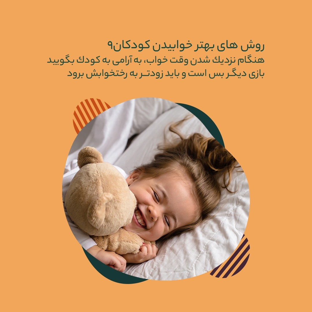 هنگام نزديك شدن وقت #خواب، به آرامي به كودک بگوييد #بازي ديگر بس است و بايد زودتر به رختخوابش برود. سپس دستش را بگيريد و او را در #مسواک زدن، پوشيدن لباس خواب، شب بخير گفتن به اعضاي #خانواده و عروسكش همراهی كنيد. و درنهايت، قبل از خواب برایش #قصه بگویید .