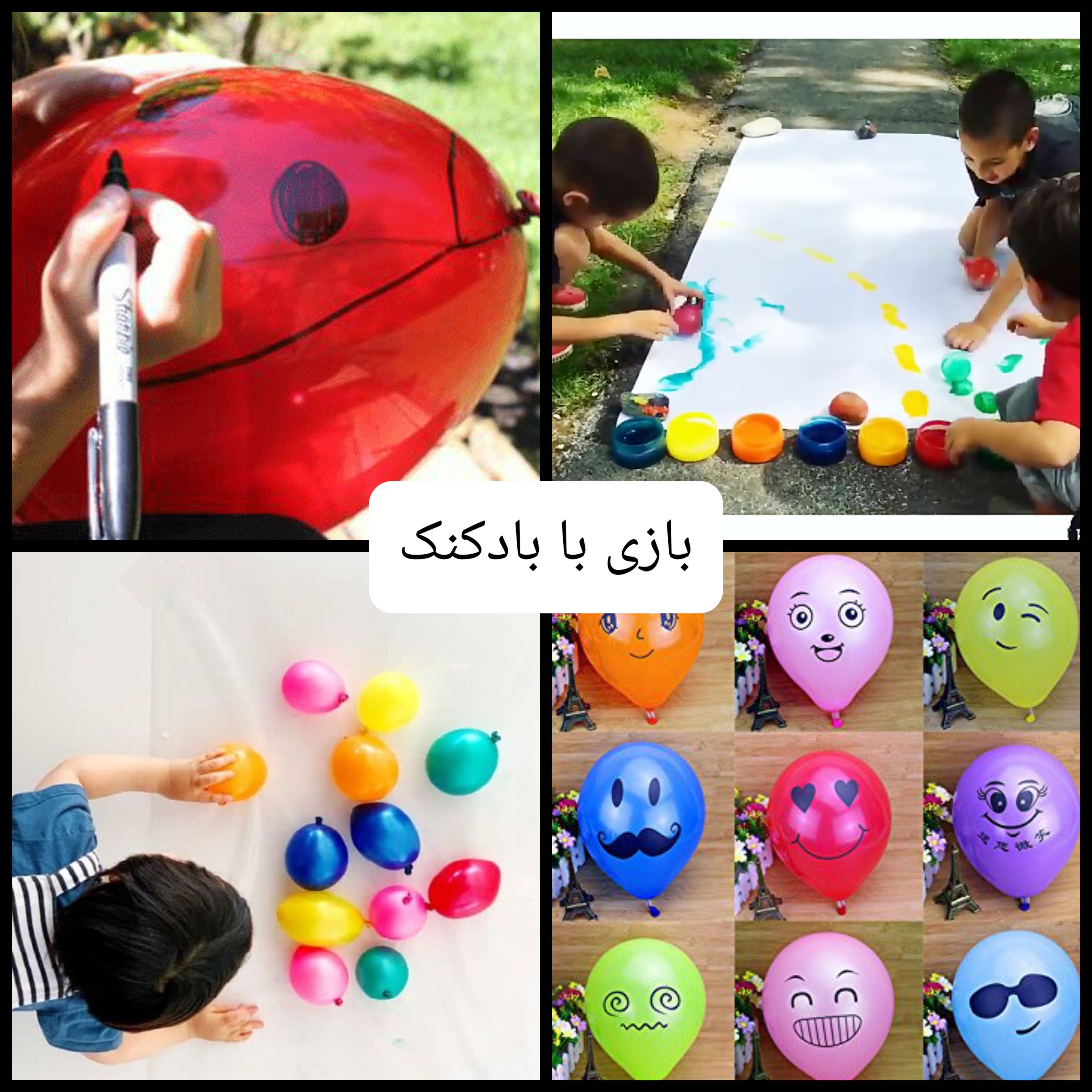 نام بازی: بادکنک بازی #بازی_ابزاری گروه سنی: ۱ تا ۳ سال وسایل لازم : بادکنک – چسب رنگی و ساده – چسب کاغذی – نخ – خودکار و ماژیک مراحل بازی : ۱) اول بادکنک ها رو در اختیار بچه ها میذاریم تا خودشون لمسش کنن و با جنس اش آشنا بشن ، در این بین میشه رنگ های بادکنک ها رو هم به بچه ها گفت. ۲) میشینیم رو زمین دور هم و بادکنک ها رو به هم میندازیم. ۳) دیدن باد شدن بادکنک ها و بعد رها شدن بادکنک باد شده خودش بازی جذابی برای بچه های به این سن است . ۴) حالا بالا انداختن بادکنک و بازی بپر بپر و بدو بدو. ۵) به بادکنک ها نخ می بندیم و میدیم دستشون که باهاش بدوند یا اینکه نخ رو به شلوارشون وصل می کنیم بعد میگیم که بدوند . ۶) بادکنک رو با نخ بالا نگه میداریم تا بچه ها بهش ضربه بزنن ، میشه برای تشویق بچه ها چسب رنگی به بادکنک وصل کنیم و در حالی که بادکنک رو بالا نگه داشتیم بگیم چسب رو بکنن. ۷) دوباره بازی نشستنی میشه ، چسب های رنگی رو در اختیار بچه ها میذاریم و چسبوندن رو بادکنک رو یادشون میدیم. در این حین باز در مورد رنگ ها صحبت می کنیم. ۸) حالا چسب های ساده و کاغذی رو میاریم ، کم کم خودکار و ماژیک ها رو هم وارد می کنیم ، و شرایط نقاشی رو بادکنک فراهم میشه. به بچه ها میگیم خودشون با رنگ کردن چسب های ساده چسب های رنگی بسازن. ۹) حالا یه طرف اتاق یه چسب کاغذی پهن رو برعکس نگه میداریم. بچه ها بادکنک های باد شده رو از یه طرف اتاق بدو بدو میبرن و می چسبونن به چسب کاغذی و بعد که همه بادکنک ها رو چسبوندن حالا برعکس باید بدو بدو بادکنک ها رو از چسب بکنند و برن بندازن تو یه سبد اون سر اتاق