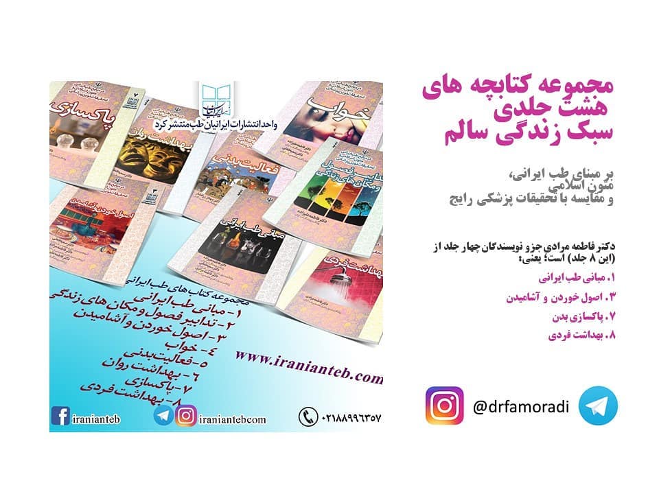 سلام بر همه عزیزان . 📗 اگر علاقمند به آشنایی با اصول #سبک_زندگی_سالم (از منظر #طب_ایرانی، تحقیقات نوین و متون اسلامی) هستید، این مجموعه کوچک ۸ جلدی را به شما معرفی می کنیم: . 1⃣ #مبانی_طب_ایرانی 2⃣ #تدابیر_فصول_و_مکان_های_زندگی 3⃣ #اصول_خوردن_و_آشامیدن 4⃣ #خواب 5⃣ #فعالیت_بدنی 6⃣ #بهداشت_روان 7⃣ #پاکسازی_بدن 8⃣ #بهداشت_فردی . . 📚 برای تهیه #کتابچه_های_سبک_زندگی_سالم (به صورت تک جلدی یا مجموعه ۸ جلدی) به: کلینیک های #دکترسریتا، #احمدیه و یا #خارک؛ یا #انتشارات_ایرانیان_طب مراجعه نمایید: @iraniantebcom www.iranianteb.com 02188996357 . . 😊به امید الویت حفظ تندرستی نسبت به درمان . 👈از طرف نویسندگان مجموعه: #دکترفاطمه_مرادی، دکتر سمیه فتعلی، دکتر فاطمه علیزاده و دکتر مهناز زرافشار. . . #سبک_زندگی_سالم #روش_زندگی #سبک_زندگی #حفظ_الصحه #حفظ_سلامتی #پاکسازی_بدن #طب_ایرانی #طب_سنتی #طب_سنتی_ایران #طب_سنتی_ایرانی #طب_ایرانی_اسلامی #طب_سنتی_اسلامی_ایرانی #دکتر_فاطمه_مرادی #دکتر_طب_سنتی #دکترفاطمه_مرادی_طب_سنتی #متخصص_طب_ایرانی #متخصص_طب_سنتی . . 🌹 لینکهای ارتباطی با دکتر فاطمه مرادی در اینستاگرام، تلگرام و سروش: @drfamoradi