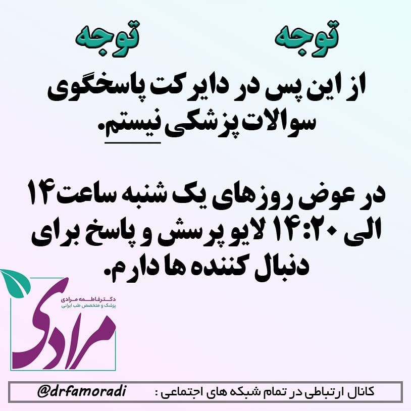 لایوهای روز یک شنبه رو فراموش نکنید. #پرسش_و_پاسخ #طب_ایرانی #طب_سنتی #متخصص_طب_ایرانی #دکتر_فاطمه_مرادی #دکتر_مرادی #سوالات_شما #لایو_پرسش_پاسخ_مرادی