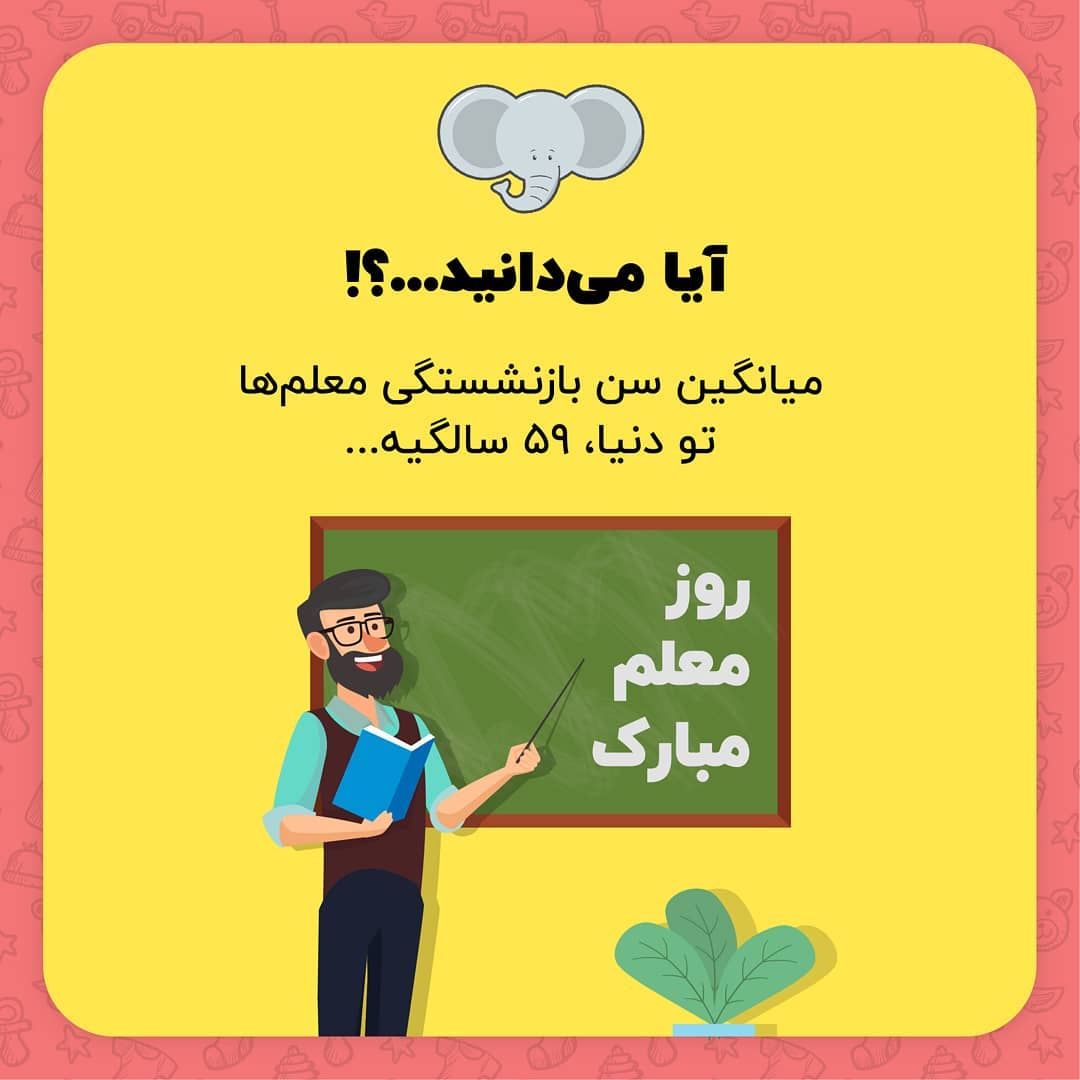 . معلمها رو منشن کنین. روز معلم مبارک 🎆🎉🎊 . میگن اگه میخوای به کسی لطفی بکنی بهش ماهی نده، بلکه ماهیگیری رو یادش بده. به مناسبت روز معلم، آیا میدانید این هفته رو به معلمهای عزیز اختصاص دادیم. میدونستید میانگین سن بازنشستگی معلمها تو دنیا، ۵۹ سالگیه؟ . . . . . . . . #معلم #آموزگار #روزمعلم #تبریک #تبریک_روز_معلم #جالبترین #مفید #دانستنیها #بچه #دانش_آموز #دانشجو #مدرسه #دانشگاه #عجیب #جالب #علمی #دانستنی #باحال #آیامیدانید #عجیب_غریب #اطلاعات_عمومی