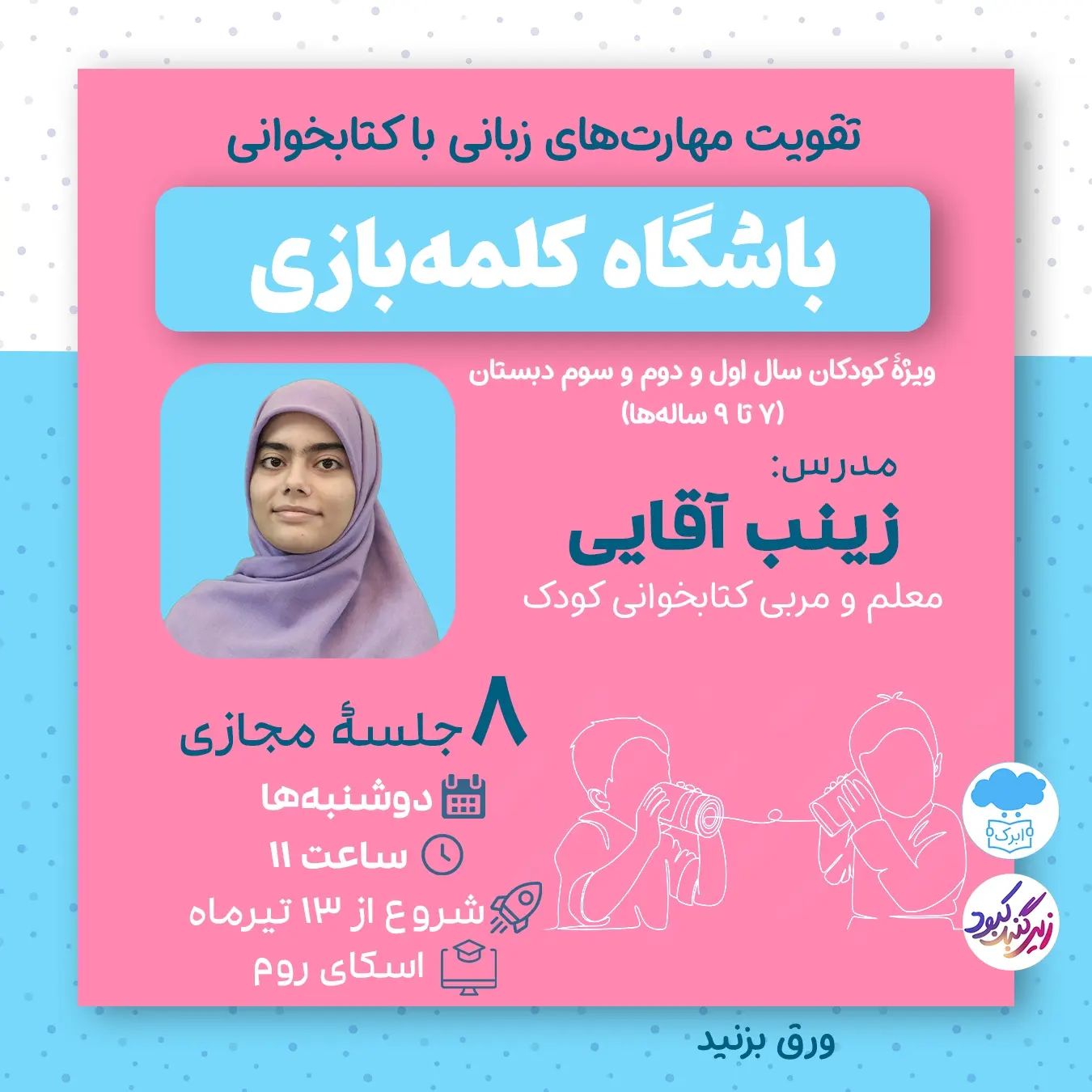 ⛱️به باشگاه تابستانی کلمات خوش آمدید! میخواهید فرزندتون در تابستان به مطالعه ادامه بده؟ از طرفی احتمالا خودش از هرچی که رنگ و بوی مدرسه و کتاب و آموزش بده فراریه! نظرتون درباره باشگاه تابستانی خواندن چیه!؟ اگر بخواهید مهارتهای خواندن فرزندتون تثبیت بشه یا با فعالیتهای چالش برانگیزتر جلو بیفته، دوره باشگاه کلمه بازی، کمک میکنه مهارت های زبانی کودک شما تقویت بشه و تازه، کلی هم بهش خوش بگذره. تجربه های خواندن تابستانی هیجانانگیز برای بچه ها! ◾اسلاید ۱: جزییات دوره آنلاین ◽اسلاید ۲: هرجلسه چه کار میکنیم؟ ◾اسلاید۳ و ۴: ،کودک شما چه مهارتهایی پیدا میکند؟ ◽اسلاید ۵: آشنایی با مربی؛ زینب آقایی ◾اسلاید ۶: کدهای #تخفیف و نامنویسی 🌐لینک نامنویسی(اسلاید نهایی) https://ppng.ir/d/ylxC 📲اطلاعات بیشتر در دایرکت یا واتساپ 09028056996 @abrakbookstore @ziregonbad #دوره #کتابخوانی #دبستان #کتاب #ابرک #بازی