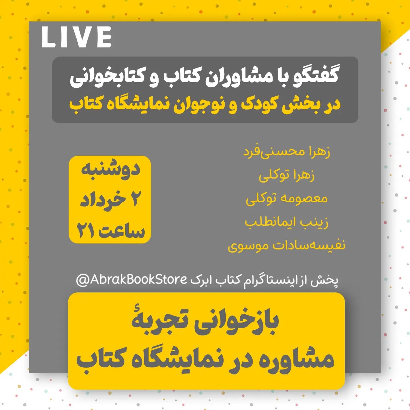 برای اولین بار، امسال در نمایشگاه کتاب غرفه مشاوره کتاب و کتابخوانی برپا شد👏 در بخش کودک و نوجوان پنج کارشناس برای مشاوره کتاب و کتابخوانی حضور داشتند. 💫حالا میخواهیم در یک گفتگوی اینترنتی، تجربه این رویداد را مرور کنیم. ☁️از حال و هوای نمایشگاه بپرسیم 🌧️ببینیم والدین و کودکان و نوجوانان در چه فضایی سیر میکردند ⛈️مهمترین سوال یا مشکل والدین برای انتخاب کتاب چی بود ☁️و مشاوران چه چیزی به آنها عرضه کردند. 🔻کارشناسان غرفه مشاوره بخش کودک و نوجوان زهرا محسنیفرد @zahra.mohsenifard معصومه توکلی @masoomehtavakoli زهرا توکلی @ztvkl زینب ایمانطلب @zeinabimantalab نفیسهسادات موسوی @nafisemousavi23 ابرک، فروشگاه تحلیلی کتاب کودک و نوجوان @abrakbookstore @abrakbookstore @abrakbookstore #نمایشگاه_کتاب #کتاب_کودک #کتاب #مشاوره