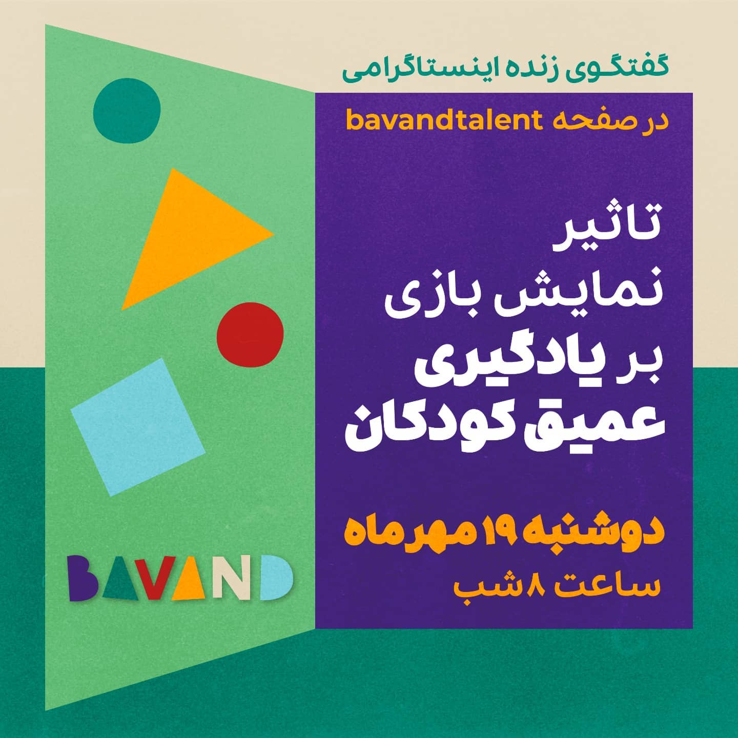 گفتگوی زنده اینستاگرامی با موضوع «تاثیر نمایشبازی بر یادگیری عمیق کودکان» 🕗 دوشنبه ۱۸ مهر ۱۴۰۰ - ساعت ۲۰:۰۰ ❓در این گفتگو به چه سوالهایی پاسخ میدهیم؟ ✅ بازینمایش چیست و چه تاثیری بر یادگیری کودک دارد؟ ✅ چه مطالبی رو میشه با بازی نمایش به کودکان یاد داد؟ ✅ آیا والدین میتوانند بازینمایش اجرا کنند؟ و دیگر سوالات در رابطه با این موضوع با حضور خانم فائزه زندیّه کارآفرین حوزه کودک مربی کودک و والدین @faezeh.zandiyeh و خانم مژگان منتصریان مربی و مدرس قصهگویی و نمایش @namayesh.khoneh شما هم سوال خود را در رابطه با این موضوع با مطرح کنید تا در گفتگویمان به آن پاسخ دهیم. . . . #bavandtalent #bavand #believeinyourself #باوند #بعدازمدرسه #آموزش #کارگاه_باوند #کارگاه #کودک #والدین #مدرسه #لایو #گفتگو #بازی #نمایش
