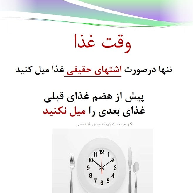 در ادامه روشهای صحیح غذا خوردن: ✔۶.رعایت وقت غذا: 🔷️تا اشتهای واقعی به خوردن غذا ایجاد نشده غذا میل نکنین. 🔶️متاسفانه امروزه ((ریزه خواری)) بصورت یکی از عادات ناصحیح غذایی درآمده. 🔷️افراد غذای کم را در دفعات زیاد میل می کنند و به دستگاه گوارش خود مجال استراحت نمیدهند. وقتی هر یکساعت یکبار لقمه ای هرچند کوچک وارد دستگاه گوارش ما می شود مدام این زبان بسته برای هضم و جذب مناسب غذا باید ترشح اسید و آنزیم داشته باشد و این کار می تواند منجر به ضعف دستگاه گوارش و کاهش کارکرد آن در دراز مدت شود. 🔶️خوب است که وعده های غذایی را ((کاملتر)) میل کنین و میان وعده ها را حذف نمایید.➡️ 🔷️خوردن غذا((هر چهار ساعت یکبار)) بدون مصرف میان وعده ها در حفظ سلامت دستگاه گوارش بسیار موثر است. 🔶️برای افرادی که به دنبال کاهش وزن بدون رژیم لاغری هستند این کار میتواند مختصری کاهش وزن را همراه داشته باشد. سالم و تندرست باشید🌷🌿 #طب_سنتی #طب_ایرانی #انجمن_علمی_طب سنتی #زندگی_ سالم #غذای _سالم #هضم _غذا #خوردن #سلامتی #تندرستی #سبک_زندگی #زندگی_بهتر #چاقی #اضافه وزن #مزاج #طبع #وقت_غذا