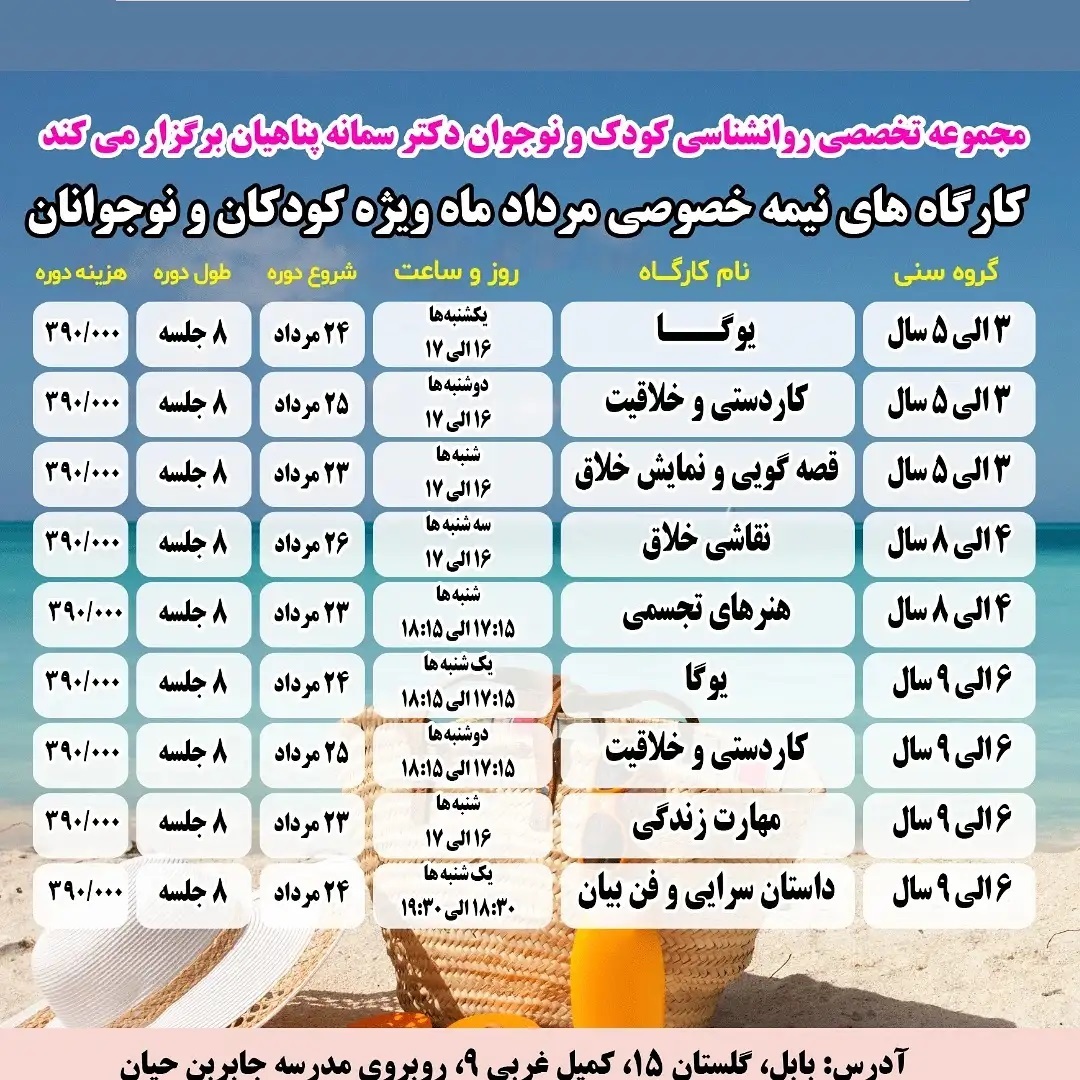 🤗سلااام سلااااام🤗اینم از برنامه ریزی کارگاه های مرداد ماه🤗 🌟پذیرش: 👈حداکثر ۶ کودک در فضای حدودا ۳۰ متری 🌟حداکثر ۸ کودک در فضای ۴۵ متری 💚 در فضایی کاملا شاد و بهداشتی 💚 💜 مازندران،بابل، کمربندی شرقی، گلستان۱۵، کمیل غربی۹، روبروی مدرسه جابربن حیان، مجموعه تخصصی روانشناسی کودک و نوجوان دکتر سمانه پناهیان 09907192574 @dr.s.panahian #کارگاه_ویژه_کودکان #کارگاه_ویژه_نوجوانان #کودک #کودکان #نوجوان #نوجوانان #کارگاه_بهار #کارگاه_مادروکودک #کارگاه_مادروکودک_بابل #کارگاه_بابل #کلاس_کودکان_بابل #کارگاه_آموزشی #کارگاهمادروکودک_بابل #کارگاهمادرکودک #دکتر_سمانه_پناهیان #روانشناس_کودک_نوجوان_بابل #روانشناس_کودک_بابل #دارنده_مجوز_رسمی_از_سازمان_نظام_روانشناسی_و_مشاوره_کشور @dr.s.panahian