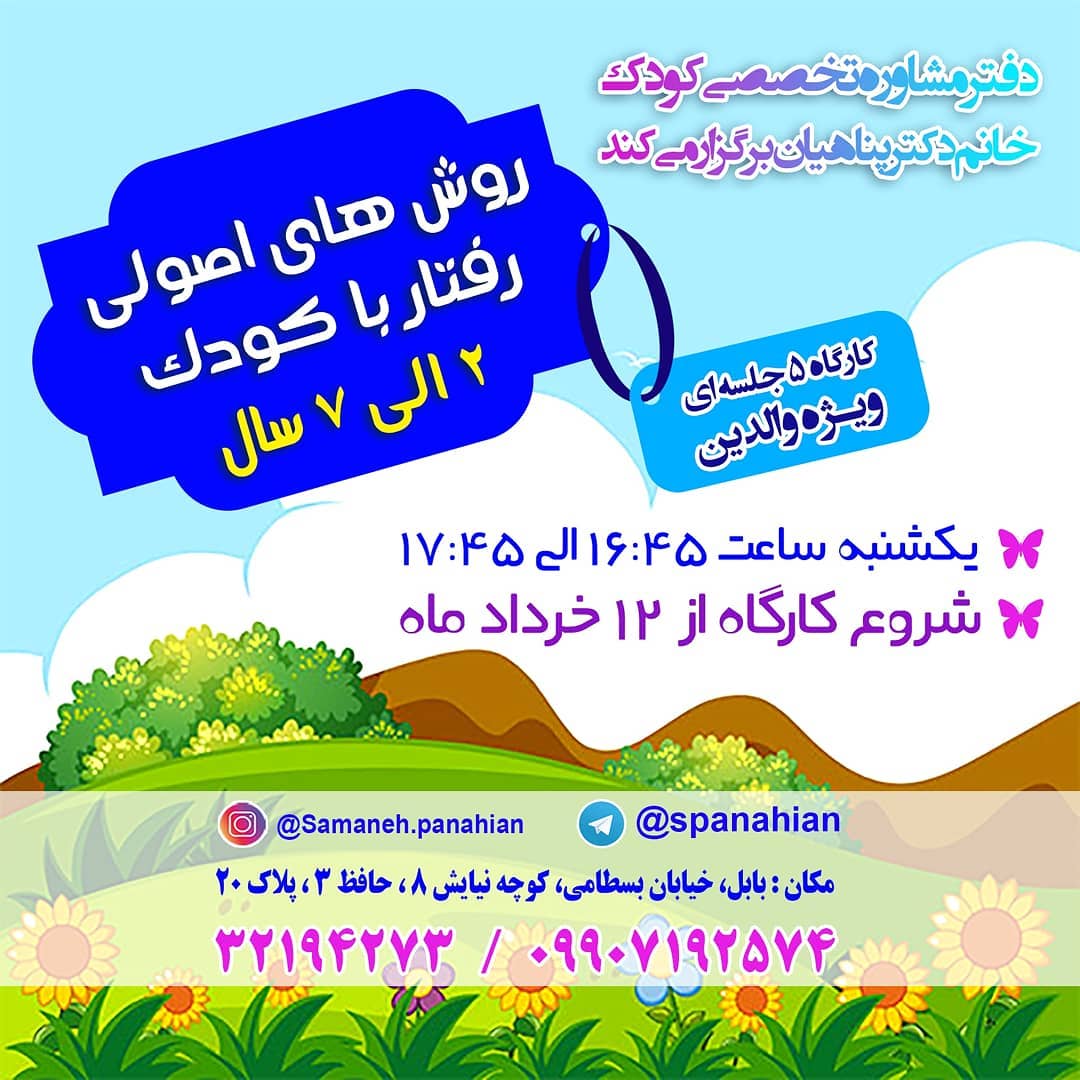 دکتر سمانه پناهیان/ روانشناس کودک و نوجوان اولین برگزار کننده کارگاه های مادر و کودک در استان مازندران آغاز فعالیت از سال 88 مازندران، بابل، کمربندی شرقی، گلستان 15، مجموعه تخصصی روانشناسی کودک و نوجوان