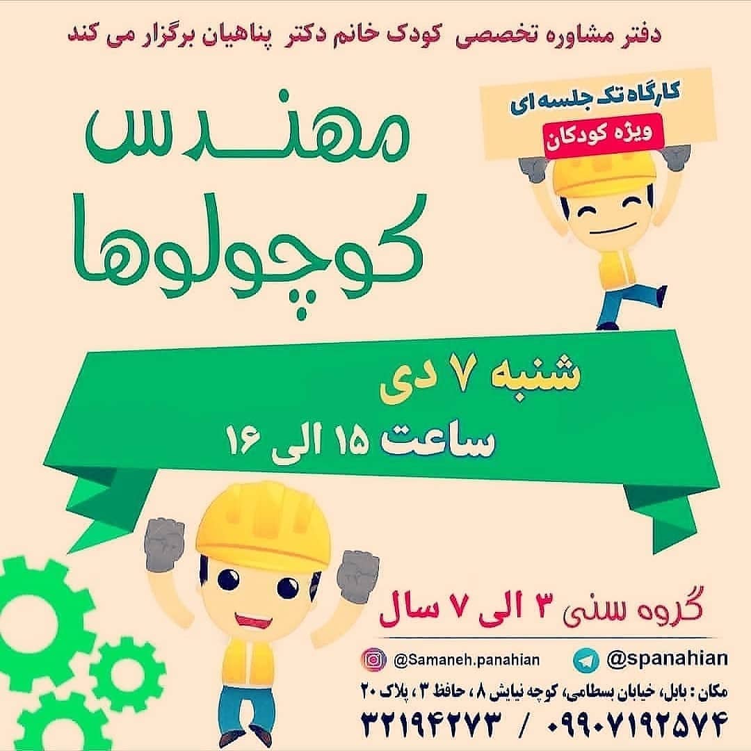 😃👌کارگاه تک جلسه ای مهندس کوچولوها👌 🌟ویژه کودکان ۳ الی ۷ سال🌟 🎆بچه ها قراره یک ساعت ساخت و ساز های جالب و جذاب انجام بدن و کلی خوش بگذرونن🎆 هزینه : ۲۸ هزار شماره های تماس جهت رزرو: ☎️09907192574 32194273 @samaneh.panahian