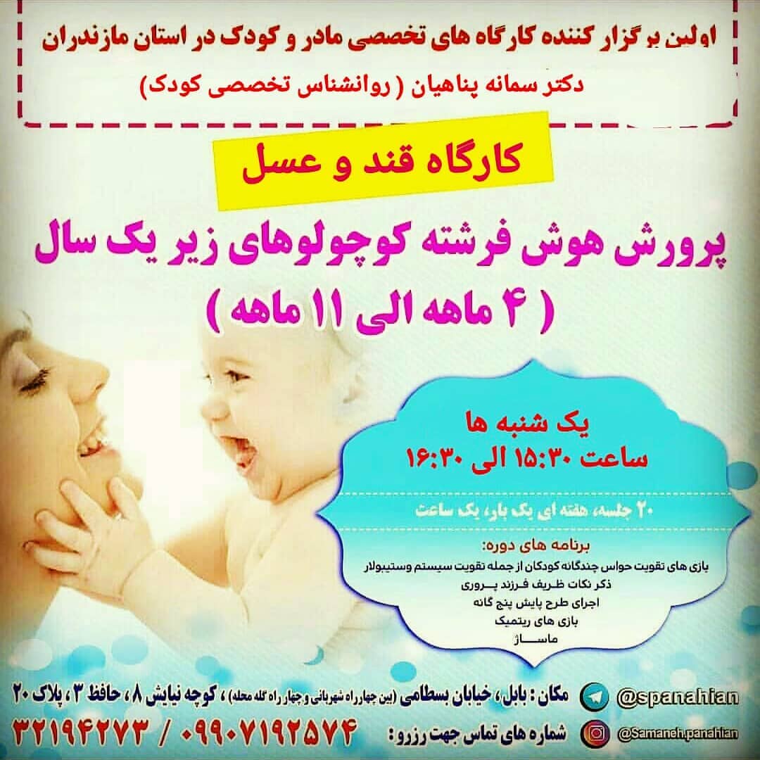😍 کارگاه قند و عسل ( پرورش حواس و هوشیاری کودکان ۴ الی ۱۱ ماه ) 🌸شروع دوره جدید از ۲۸ مهر، یک شنبه ها، ساعت ۱۵:۳۰ الی ۱۶:۳۰ 💠 مازندران، بابل، خیابان بسطامی، کوچه نیایش۸، حافظ۳، پلاک ۲۰، دفتر مشاوره تخصصی کودک خانم دکتر پناهیان برای گرفتن اطلاعات بیشتر و ثبت نام تماس بگیرید تا راهنمایی های لازم دریافت کنید ☎️09907192574 32194273 @samaneh.panahian #دکتر_سمانه_پناهیان #روانشناس_کودک #اولین_برگزارکننده_کارگاههای_تخصصی_مادروکودک_دراستان_مازندران #دارنده_مجوز_رسمی_از_سازمان_نظام_روانشناسی_و_مشاوره_کشور
