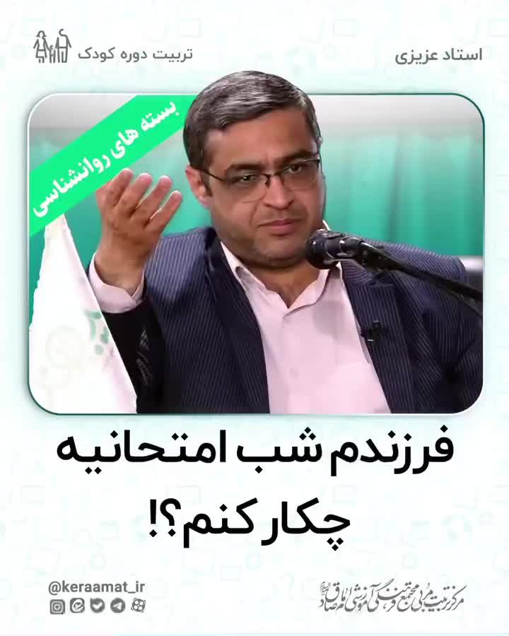 . 📍فرزندم شب امتحانیه چکار کنم؟؟🧐 بعضی بچه ها زمان محوراند و بعضی توان محور. زمان محورها وقتی در فشار زمان قرار میگیرند دچار فشار عصبی میشوند و دیگر درس را نمیفهمند. اما توان محورها، وقتی در فشار قرار میگیرند، توانشان بیشتر میشود. توان محورها اگر وقت اضافی دارند، نباید به آنها دائم تذکر داد که برو درست را بخوان! بلکه باید او را تشویق کرد تا فعالیتهای جسمی دیگر انجام دهد. معمولاً این دسته افراد، برون گرا هستند. اعتماد به نفس بالا، ریسکپذیر و شاد و عجول. اما زمان محور ها معمولاً درونگرا هستند. حساس، اعتماد به نفس پایین اما مسئولیت پذیر. در یک خانه اگر دو بچه وجود داشته باشد، بچه اول اگر درونگرا باشد، بچه دوم برونگر میشود. بنابراین نباید بچهها را با هم مقایسه کنیم، چون ویژگیهایشان با هم متفاوت است. 🔖دکتر سعید عزیزی. @drsaeedazizi 📚دوره شخصیت شناسی نوجوان 📌ما در کرامت، برایتان از اندیشه های مختلف تربیتی می گوییم، چراکه نگاه نقادانه ی شما ارزشمند است. #کرامت #آموزش #تربیت #دکتر_عزیزی #درونگرا #برونگرا #عجول #امتحان #ورزشکار #تشویق #مسئولیت_پذیر #اعتماد_به_نفس #ریسک پذیر