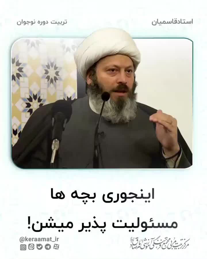 . 📍اینجوری بچه ها مسئولیت پذیر میشن! ✅هر کاری که میخواهید بچهها انجام دهند، اول ببینید خودتان میتوانید انجام دهید یا نه و بعد برنامه ریزی کنید که بتوانید انجام دهید. از نظافت مدرسه تا اتاق خود و چای آوردن و ... . اصلا این کار حس فراعنه دارد که آدم مثلاً زنگ بزند و برای او چای بیاورند! باید خودمان برای خود چای بریزیم. اگر این شود میتوان به بچهها گفت که در ژاپن بچهها مدرسه را خودشان تمیز میکنند. ما در حوزه خودمان هر چه به طلبهها میگفتیم اتاقتان را تمیز کنید توجهی نمیکردند. گفتم گیر کار این است که خودمان این کارها را انجام نمیدهیم. یک برنامه ریزی کردیم که مسئولین و اساتید به نوبت کلاسها و سرویسهای بهداشتی را نظافت کنیم. این باعث میشود از ظرائف کار هم مطلع شوند و این شیوه اهل بیت بوده که خودشان تا کف کار پیش میرفتند. 🔖حجت الاسلام قاسمیان. کرامت ۱. 📌 ما در کرامت، برایتان از اندیشه های مختلف تربیتی می گوییم، چرا که نگاه نقادانه ی شما ارزشمند است. #کرامت #آموزش #تربیت #رسانه #قاسمیان #نوجوان #حجت_الاسلام_قاسمیان #