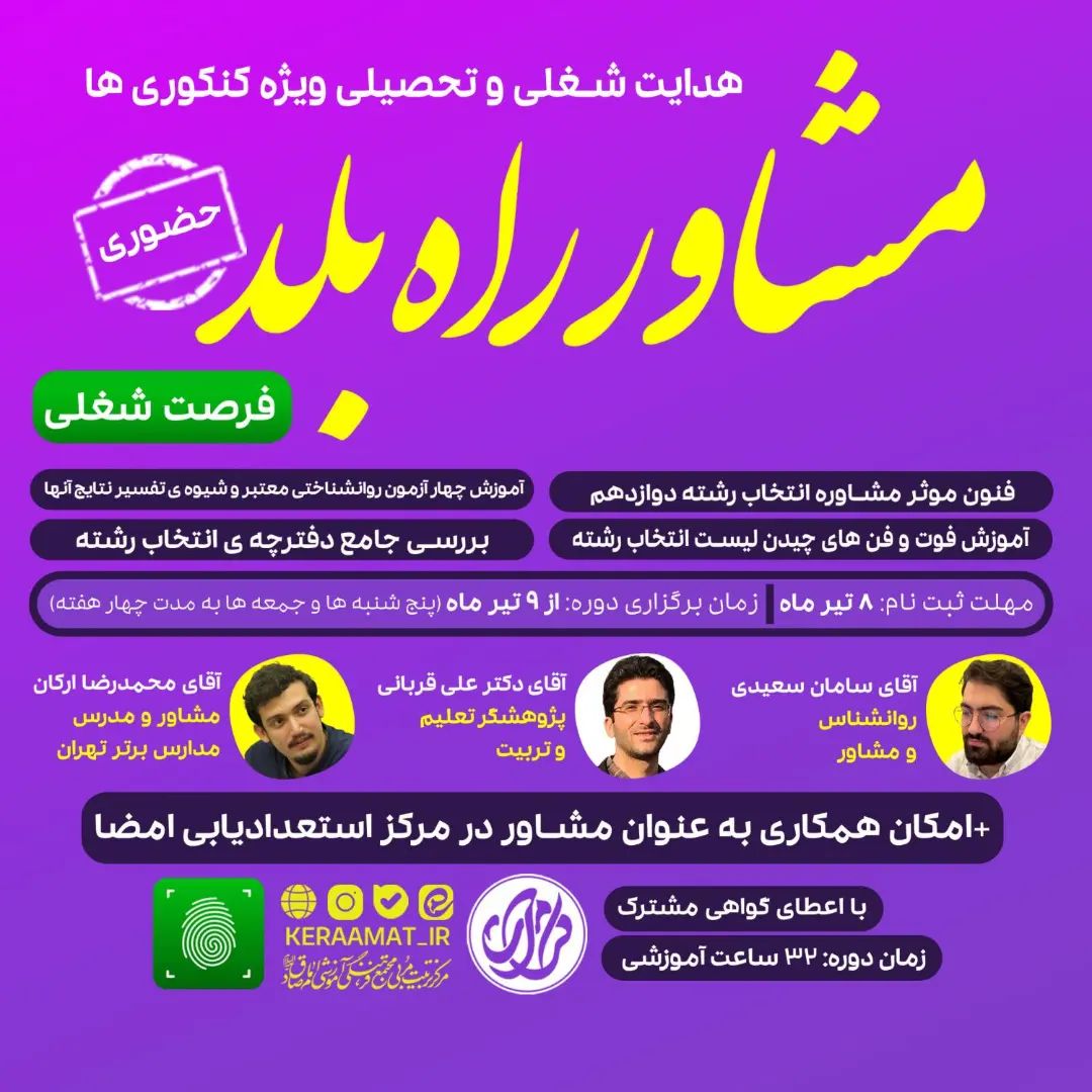 . 💡 *دوره ی حضوری تربیت مشاور راه بلد* 🛑 «همراه با امکان همکاری به عنوان مشاور در مرکز استعدادیابی امضا و همکاری در پروژه ی انتخاب رشته ی نخبگان، مرداد ۱۴۰۱» 🔸 ۳۲ ساعت آموزشی ⏰ زمان: از ۹ الی ۳۱ تیرماه به مدت ۸ جلسه در روزهای پنجشنبه (ساعت۱۴ تا ۱۸) و روزهای جمعه (ساعت ۹ تا ۱۳) 🏢 مکان: آمفی تئاتر دبیرستان دخترانه امام صادق علیه السلام (شهرک غرب) ⛔️ مهلت ثبت نام: ۸ تیرماه ⭕️ پشتیبانی و دریافت کد تخفیف با keraamat_majazi@ 🌐 اطلاعات بیشتر و ثبت نام www.keraamat.ir #کرامت #تربیت #نوجوان #کنکور #مشاور #پشتیبان #استعدادیابی #استعداد