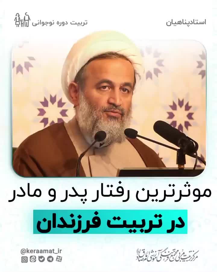 مهمترین رفتار پدر و مادر که روی بچه ها اثر میگذارد، قدرت تحمل مشکلات و صبر از سوی آنهاست. اگر پدر و مادر، کارهای خوب را به دلیل دوست داشتن آن کارها انجام دهند، نمیتوانند راهنمای بچه ها باشند. مثلاً اگر دلیل نماز خواندن را دوست داشتن این عمل نشان دهند، بچه هم با خودش میگوید؛ پدر و مادرم این کار را دوست دارند که انجام می دهند، پس من هم کاری را که دوست داشته باشم، انجام خواهم داد!! کلیدی ترین عامل تربیت فرزند، از بین بردن مهمترین عامل بی تربیتی انسان است و آن تحمل مشکلات است. بچه وقتی صبر پدر و مادر را میبیند، یک رشد صعودی میکند. هیچ خوبی مثل صبر و هیچ بدی مثل بی صبری نیست. 🔖حجت الاسلام پناهیان. ✅ما در کرامت، برایتان از اندیشه های مختلف تربیتی می گوییم، چراکه نگاه نقادانه ی شما ارزشمند است.🌹 #پناهیان #صبر #تحمل_مشکلات #تربیت # والدین #نماز #دوست_داشتن #فرزند #خوب