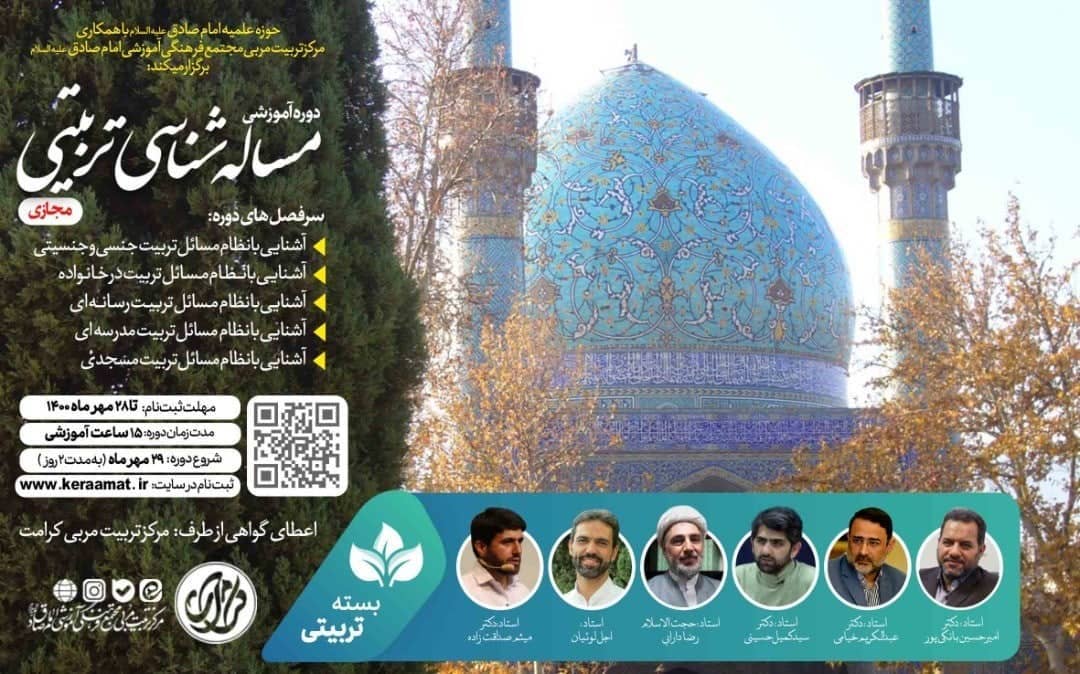 💡 دوره آموزشی برخط مساله شناسی تربیتی 🔸 ۱۵ ساعت آموزشی طی ۲ روز ⛔️ زمان برگزاری: ۲۹ و ۳۰ مهر 🔴 *این دوره به صورت برخط (آنلاین) برگزار میشود.* ⭕ مبلغ ثبتنام: ۲۰۰ هزار تومان 📌همراه با اعطای گواهی معتبر از طرف حوزه علمیه امام صادق (ع) و مرکز تربیت مربی مجتمع امام صادق (ع) 🌐 اطلاعات بیشتر و ثبت نام در www.keraamat.ir