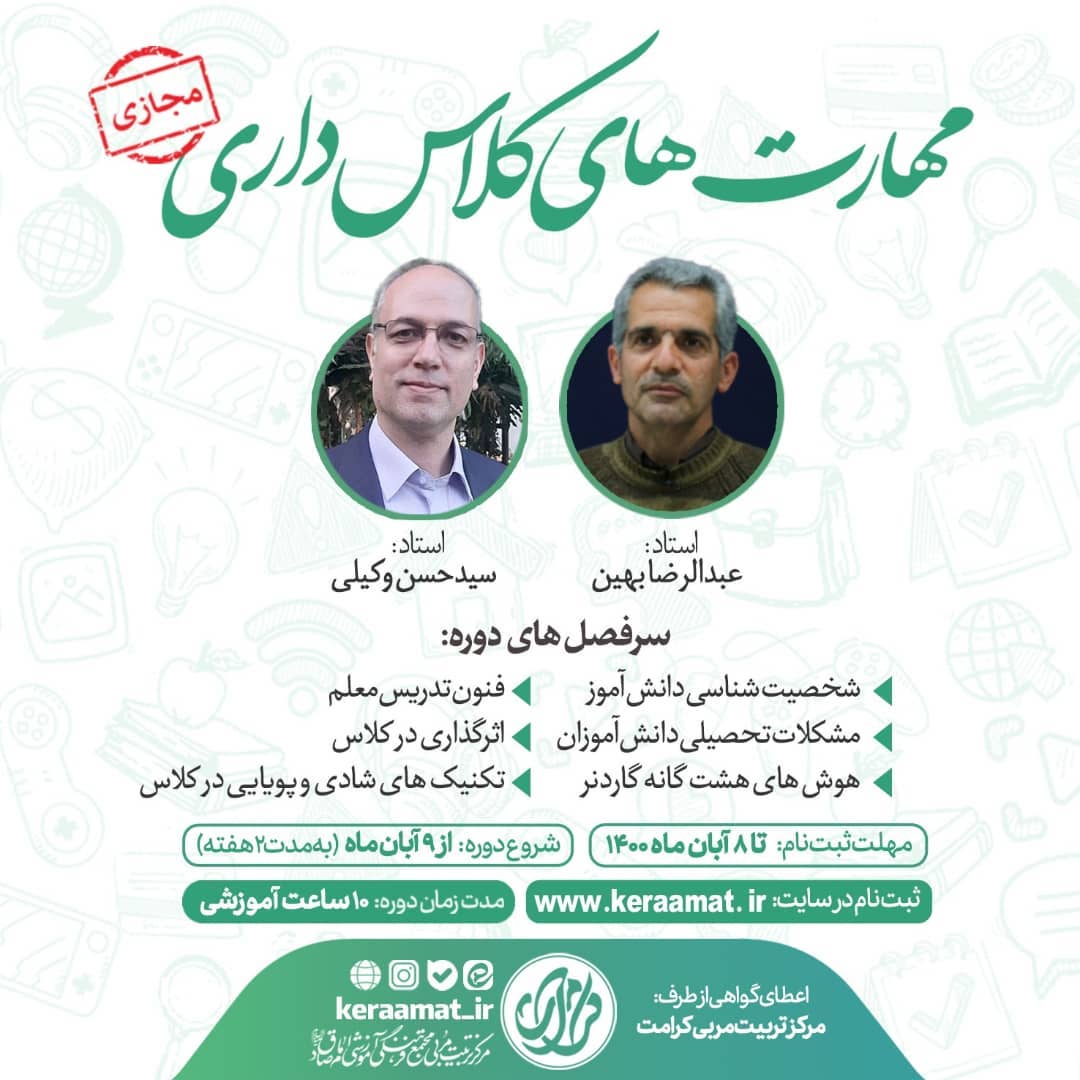 💡 دوره آموزشی مجازی مهارت های کلاسداری 🔸 ۱۰ساعت آموزشی طی ۲ هفته ⛔️ شروع دوره: ۸ آبان 📌همراه با اعطای گواهی معتبر از سوی مرکز تربیت مربی مجتع امام صادق (ع) 🌐 اطلاعات بیشتر و ثبت نام در www.keraamat.ir