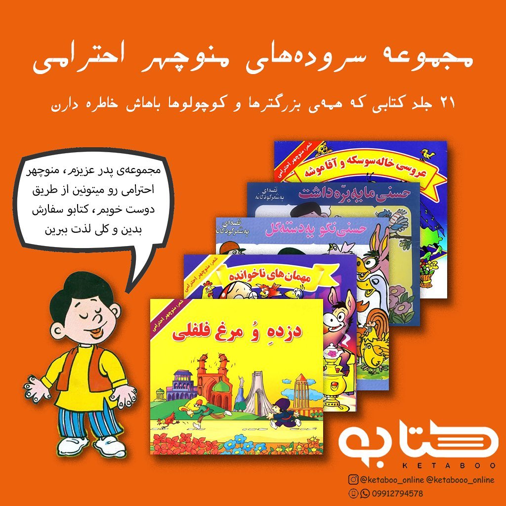 💫 مجموعهی ۲۱ جلدی سرودههای مرحوم منوچهر احترامی 🎯 مرور خاطرات کودکی والدین و خوندن کلی شعر قشنگ برای کوچولوهای دوست داشتنی😍 📚 این پک ۲۱ جلدی شامل کتابهای زیره: ۱- خرس و کوزه عسل🐻: مهربانی با حیوانات و آشنایی با زنبور و خواص عسل ۲- خروس نگو یک ساعت🐓: معرفی حیوانات و تشویق به سحرخیزی ۳- حسنی ما یه بره داشت🐑: آشنایی با کاربردهای حیوانات برای ما ۴- مهمان های ناخوانده🙋: مهمان نوازی، مهربانی و آداب مهمانداری ۵- دزده و مرغ فلفلی🐔: ایران گردی، آشنایی با شهرها و سوغات آنها ۶- حسنی نگو یه دسته گل🧖: نظافت، تمیزی و حمام کردن ۷- موش دم بریده🐭: آموزش مشاغل از جمله ریسندگی نخ، پینه دوزی، کفاش و ... ۸- حسنی و سه بزغاله🐏: تشویق به امانت داری ۹- عروسی خاله سوسکه👰♀️: معرفی انواع پوشاک، پارچهها و لباسها ۱۰- موش موشی🐁: معرفی حیوانات، گوش کردن به حرف پدر و مادر ۱۱- حسنی باباش یه باغ داره🏡: معرفی انواع حیوانات از جمله کلاغ، لکلک و ... ۱۲- قصه موش و گربه برخوانا🐱: گرفتن حق خود و مبارزه با ستم ۱۳- حسنی و گرگ ناقلا🐺: آموزش حواس جمعی و آشنایی با حیوانات ۱۴- دویدم و دویدم🏃♀️: معرفی مشاغل از جمله چوپانی، نانوایی و ... ۱۵- سلیمان بابا سلیمان🎅: آموزش انضباط، نظم و مرتب بودن ۱۶- ده تا جوجه رفتن تو کوچه🐥: آموزش شمارش به شعر از یک تا ده ۱۷- گربه من نازنازیه🐈: آشنایی با خصلتهای بد مثل تنبلی و تشویق به رفتارهای خوب ۱۸- فلفلی و کرم ابریشم🦋: چگونگی تبدیل کرم به پروانه و صبر و بردباری ۱۹- گنجشکک اشی مشی🐣: ترانه نوستالژی ۲۰- علیمردان خان👨🦰: آشنایی با ویژگیهای رفتاری خوب و بد ۲۱- فیل اومد آب بخوره🐘: آشنایی با دندانپزشک، مسواک زدن و مراقبت از دندان ⚠️ دوستان عزیز توجه داشته باشین که در بازار حدود ۴۰۰ جلد کتاب حسنی وجود داره ولی کتابهای حسنی اصلی داخل همین مجوعهست برای سفارش و اطلاعات بیشتر میتونید از راههای زیر اقدام کنید🤗 دایرکت اینستاگرام تلگرام، واتساپ و تماس 09912794578 —————— #حسنی #منوچهر_احترامی #نوستالژی #قدیمی #کتابو #کتابو_کودک #یک_تا_سه_سال #سه_تا_نه_سال #حسنی_نگو_بلا_بگو