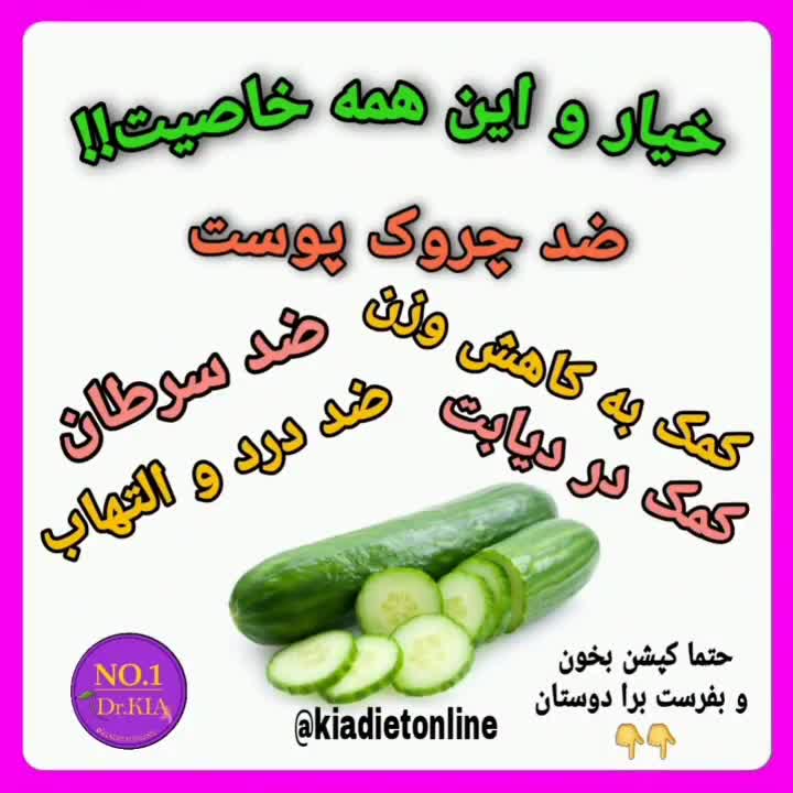 🔴🔴فرزند شما هم خیار دوست دار❓️خیارشور چطور؟ شما خیارشور چطوری درست میکنید؟ ⭕️⭕️شاید بارتون نشه که خیار این همه فایده ها داشته باشه. •خیار به طور قابل ملاحظهای می تواند تشنگی را تسکین دهد سرشار از رطوبت و آب هست. •کوکوربیتاسین B یک ماده طبیعی است که به وفور در خیار کشف میشود و پتانسیل ضد سرطانی را عمدتاً از طریق القای آپوپتوز در سلولهای سرطانی مختلف انسانی اعمال میکند.همچنین دارای فعالیت شیمیایی پیشگیری کننده قوی علیه سرطان پروستات انسان است. 🥒🥒🥒 •پوست خیار منبع خوبی از فیبر رژیمی است که به کاهش یبوست کمک میکند و با از بین بردن تودههای سمی از شکم، تضمینی برای سرطانهای روده بزرگ است. •خیار حاوی آنتی اکسیدان های منحصر به فرد در نسبت های متوسطی مانند فیستین(ضددرد )، بتا کاروتن و α-کاروتن، ویتامین C، ویتامین A، زآگزانتین و لوتئین است. این ترکیبات به عنوان محافظ، نقش مهمی در پیشرفت دیابت و مشکلات مرتبط با آن در تولید رادیکال های آزاد و تضعیف سیستم های دفاعی آنتی اکسیدانی دارند. ⭕️ همچنین آب خیار برای مو، پوست و ناخن بسیار مفید است. محققان دریافته اند که خیار منبع اسید اسکوربیک است و دارای پتانسیل ضد هیالورونیداز و ضد الاستاز است که استفاده از خیار را به عنوان یک عامل ضد چروک احتمالی مناسب می کند. استفاده از خیار برای مشکلات پوستی مختلف از جمله تورم زیر چشم و آفتاب سوختگی مناسب است. خیار منبع غنی سیلیکون است که برای بافت های همبند سالم، رباط ها، غضروف ها و غیره مفید است. 🔴خیارشور تخمیر شده طبیعی متعلق به محصولاتی است که با نمک و سرکه، به دلیل داشتن باکتری های اسید لاکتیک پروبیوتیک (LAB) از نظر سلامتی مفید هستند که مانع رشد میکروارگانیسم های ناسالم در روده می شود .آنها سرشار از ویتامین K هستند که نقش حیاتی در رشد توده استخوان ایفا می کند. •علاوه بر این، در درمان بیماران مبتلا به آلزایمر با محدود کردن آسیب عصبی در مغز آنها استفاده می شود. ❌️❌️اما خیار شور رو بدلیل داشتن نمک زیاد ، هر روز نخورید ها. فشار خون تون بره بالا. @kiadietonline ➖➖➖➖➖➖➖➖➖➖➖➖➖➖ 📞 02188563201 📱 09021888035 تهران، شهرک غرب📍 ➖➖➖➖➖➖➖➖➖➖➖➖➖➖ 🔻Foreign patients are admitted ➖➖➖➖➖➖➖➖➖➖➖➖➖➖#افزایش_قد #چاقی#برنامه_غذایی #افزایش_وزن #جوانی #دکتر_کیا#مشاور_تغذیه_کودکان #ضدچروک #خیارشور#چاقی_کودک #کاهش_وزن #خیار #قد_کودک #ضدسرطان #پروبیوتیک