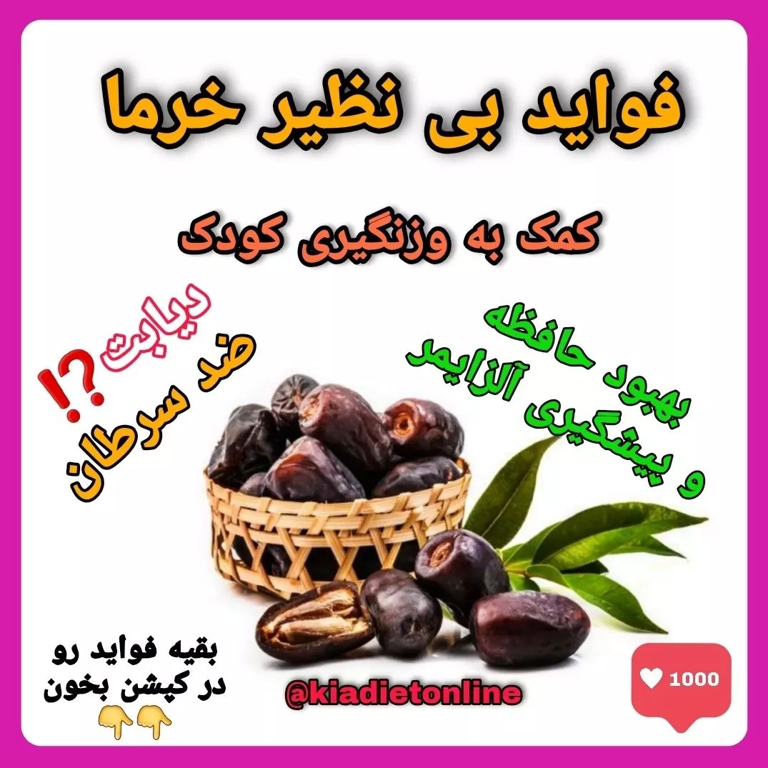 🔴🔴شما خرمای زرد دوست دارین یا خرمای سیاه ؟ خشک یا تازه ⁉️ 🌰🌰 هر کدوم که باشه ، یک میوه بسیار مغذی که 100 گرم آن مواد مغذی زیر را فراهم می کند : • کالری: 277 • کربوهیدرات: ۷۵ گرم • فیبر: ۷ گرم • پروتئین: ۲ گرم • پتاسیم: 20٪ از RDI • منیزیم: 14 درصد از RDI • مس: 18٪ از RDI • منگنز: 15 درصد از RDI • آهن: 5٪ از RDI • ویتامین B6: 12٪ از RDI • سرشار از فیبر و آنتی اکسیدان های فلاونوئید، کاروتنویید ، اسید فولیک ⭕⭕ مصرف روزانه🔺️ ۳ عدد 🔺️خرما : • سلامت استخوان: خرما حاوی چندین ماده معدنی از جمله فسفر، پتاسیم، کلسیم و منیزیم است. همه اینها در تشکیل استخوان و پیشگیری از پوکی استخوان موثرند. • کنترل قند خون: خرما به دلیل داشتن شاخص گلیسمی پایین، فیبر و آنتی اکسیدانها، پتانسیل کمک به تنظیم قند خون را دارد. • بهبود عملکرد مهر و پیشگیری از تشکیل پلاک های آلزایمر و بهبود حافظه در کودکان. • پیشگیری از سرطان دستگاه گوارش •بهبود سیستم ایمنی ❌❌ بدلیل کالری بالا ، بیشتر از ۳عدد برای همه افراد ، توصیه نمی شود . 🔴این پست می تونه برای دوستاتون مفید باشه براشون ارسال کنید، ممنونم که سیو و لایک می کنید♥️ @kiadietonline ➖➖➖➖➖➖➖➖➖➖➖➖➖ 📞 02188563201 📱 09021888035 تهران، شهرک غرب📍 ➖➖➖➖➖➖➖➖➖➖➖➖➖ 🎀خدمات ما : ارائه مشاوره حضوری وآنلاین برای اضافه وزن،لاغری ، بیماریها(قلبی، دیابت، کلیوی،کید چرب، فشارخون، کنسر، آلزایمر، یبوست، گیاهخواری و..) ، چاقی کودکان،رشدقدی، کم وزنی ، بد غذایی 🔻Foreign patients are admitted ➖➖➖➖➖➖➖➖➖➖➖➖➖ #افزایش_قد #چاقی#برنامه_غذایی #افزایش_وزن #دکتر_کیا#مشاور_تغذیه_کودکان #لاغری#چاقی_کودک #کاهش_وزن #رژیم #رشدکودک#غذای_کودک #خرما #وزنگیری #چاقی_کودکان#لاغری #قدکودکان