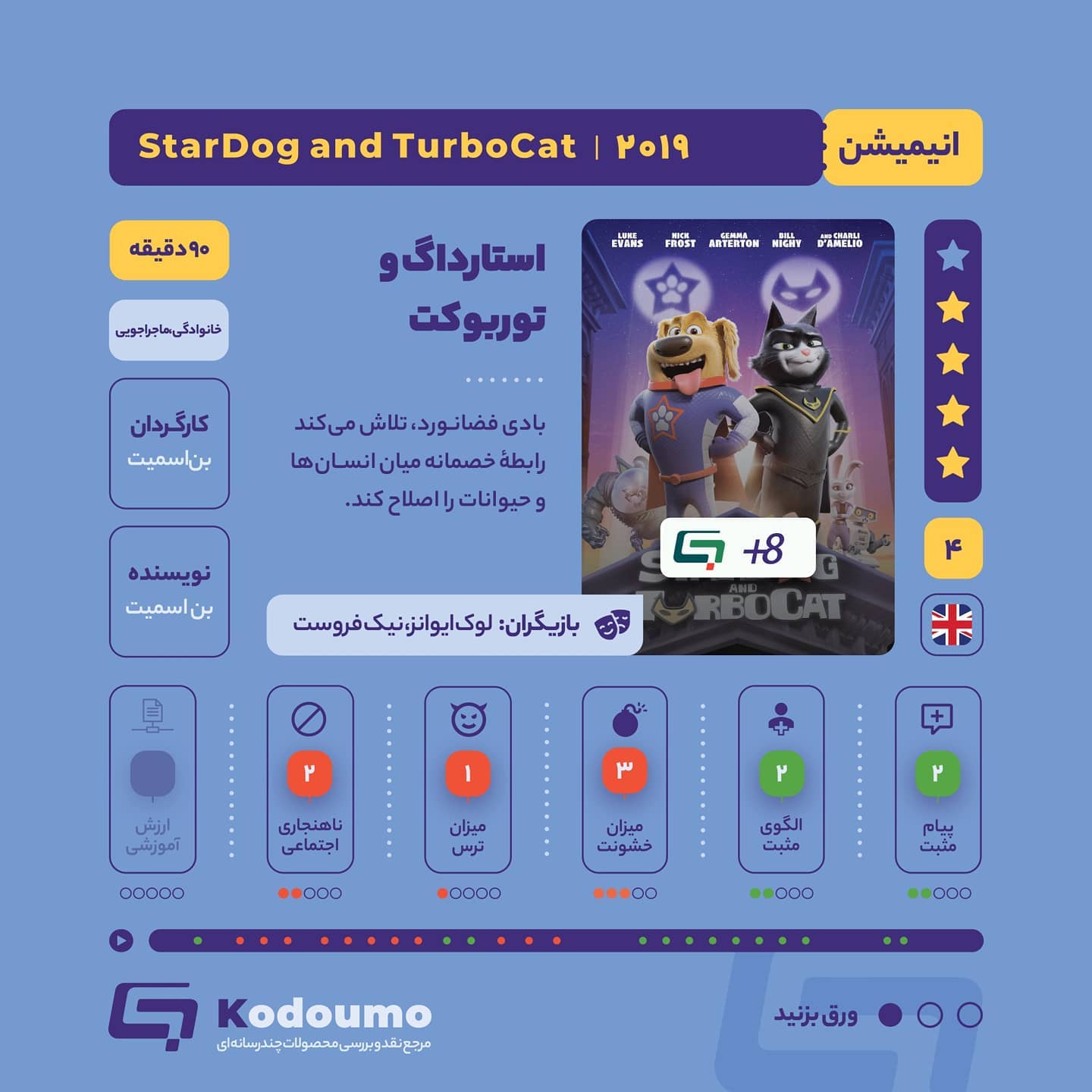 🎥 انیمیشن استارداگ و توربوکت 📍انیمیشنی کمدی و فانتزی که ابرقهرمانان اون یه سگ و یه گربه هستن. این انیمیشن روابط حیوانات و انسانها رو روایت میکنه. سگی که سالها پیش به فضا رفته ، به زمین برمیگرده و متوجه میشه در این مدت انسانها و حیوانات نسبت بههم احساس خطر پیدا کردن. 📍این انیمیشن در یک نمایی از روابط زندگی انسانها به نمایش گذاشته شده که اونها رو در محیطی ساکت، مشغول بهخودشون و کمتوجه به اطرافیان نشون میده. این نوع نمایش از انسانها برای کودکان شما موجب تعجب میشه. 📌 بیشتر بدانید : lish.ir/1IQH 🔗 کدومو؛ همپای خانوادهها @Kodoumo #کدومو #انیمیشن #والدین #تربیت