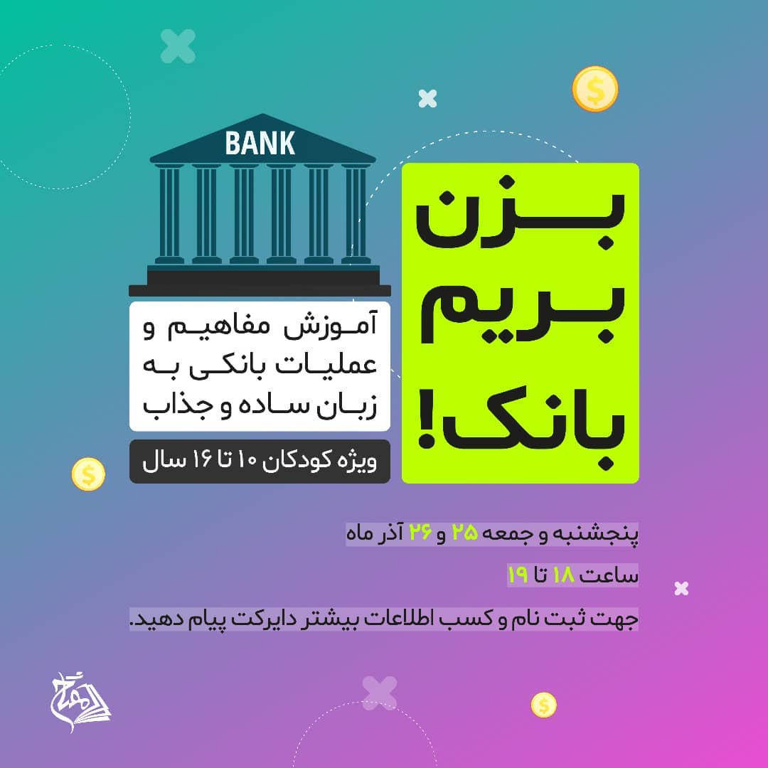 . بزن بریم بانک😉 آشنایی با بانک از مفاهیمی هست که یادگیریش در آینده فرزند تون تاثیر بسزایی داره. درواقع بچه ها از سنین نوجوانی باید یاد بگیرن که چطور میتونن از خدمات بانکی استفاده کنن.🏢 . برای اولین بار؛ کلاس آموزش مفاهیم و عملیات بانکی به زبان ساده و جذاب ویژه کودکان ۱۰ تا ۱۶ سال😍 پنجشنبه و جمعه ۲۵ و ۲۶ آذر ماه ساعت ۱۸ تا ۱۹ "کلاس مجازی در محیط اسکای روم" مدرس: سرکار خانم جلوخانیان؛ کارشناسی ارشد اقتصاد، مدرس و پژوهشگر تربیت اقتصادی کودکان . 💸 قیمت اصلی دوره: ۱۲۰ هزار تومان جهت ثبت نام و کسب اطلاعات بیشتر به دایرکت پیام دهید. . . . #بانک #بانکداری #نوجوان #اقتصاد #خدمات_بانکی #کلاس_مجازی #کلاس_آنلاین #موسسه_فرهنگی #آموزش #کلاس_آموزشی #ثبت_نام #دوره_آموزشی #تربیت_فرزند #تربیت_اقتصادی #اقتصادی
