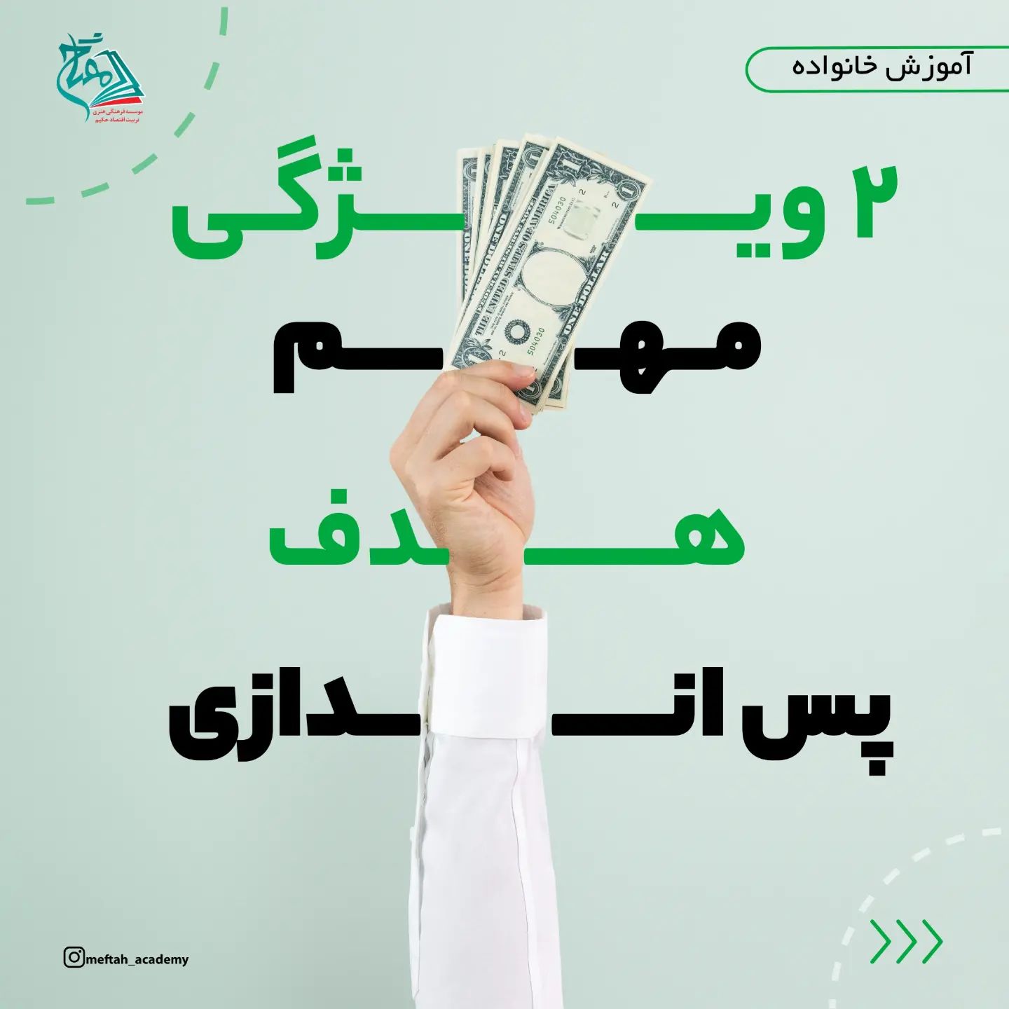 😍 . هدف پس اندازی یعنی اون چیزی که بچه ها برای رسیدن بهش پولاشونو جمع میکنند. . این هدف چندتا ویژگی داره که اینجا ۲ تا از مهم تریناش و براتون آوردیم: ✔۱- قابلیت دسترسی داشته باشه ✔۲-تورم توش لحاظ بشه . توی کلاسهای سواد مالی و اقتصادی علاوه بر تمام نکات مربوط به پس انداز، نکات مربوط به پول تو جیبی، خرید کردن، شغل و کار ، انتخاب و تصمیم گیری و.... یاد میگیریم. . کلاسها برای رده های سنی ۶تا۹، ۹تا۱۲، ۱۲ تا۱۵ و والدین برگزار میشه. برای اطلاعات بیشتر پست های قبلی رو ببینید 🥰 . برای ثبت نام به دایرکت مراجعه کنید یا به شماره 09029292935 پیام واتساپی بدید.😍 . مفتاح؛ موسسه فرهنگی تربیت اقتصاد حکیم @meftah_academy #پس_انداز# تربیت_اقتصادی#سواد_مالی#سواد_مالی_نوجوان#مفاهیم_اقتصادی #موسسه_تربیت_اقتصادی_مفتاح #کلاس_انلاین#کلاس_اقتصادی#مفتاح_حکیم #اقتصاددان_شو #اقتصاد#اصفهان #اقتصاد_برای_کودکان#سواد_مالی_کودکان