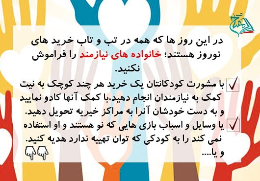 یک توصیه ی خوب: . ✔در این روز ها که همه در تب و تاب خرید های نوروز هستند، خانواده های نیازمند را فراموش نکنید. . ✔در این مورد با کودکان صحبت کنید و آنها را از حال و روز افراد نیازمند مطلع کنید. . ✔با مشورت کودکانتان یک خرید هرچند کوچک به نیت کمک به نیازمندان انجام دهید، با کمک آنها کادو نمایید و به دست خودشان آن را به مراکز خیریه تحویل دهید. . ✔و یا میتوانید مقداری پول را هرچند ناچیز و کم به کودکانتان داده تا با دست خودشان به مراکز خیریه تحویل دهد. . ✔✔🏡 با اینکار هم به زندگی و مالتان برکت دهید و هم فرهنگ کمک به همنوع و کار خیر را در کودکانتان نهادینه کنید. ◀مفتاح؛موسسه فرهنگی هنری تربیت اقتصاد حکیم @ecoedu_meftah #کمک#کمک_مالی#کمک_غیر_نقدی #کمک_به_نیازمندان#عید#عید_نوروز #خانه_تکانی#هدیه#بخشش#تربیت_اقتصاد