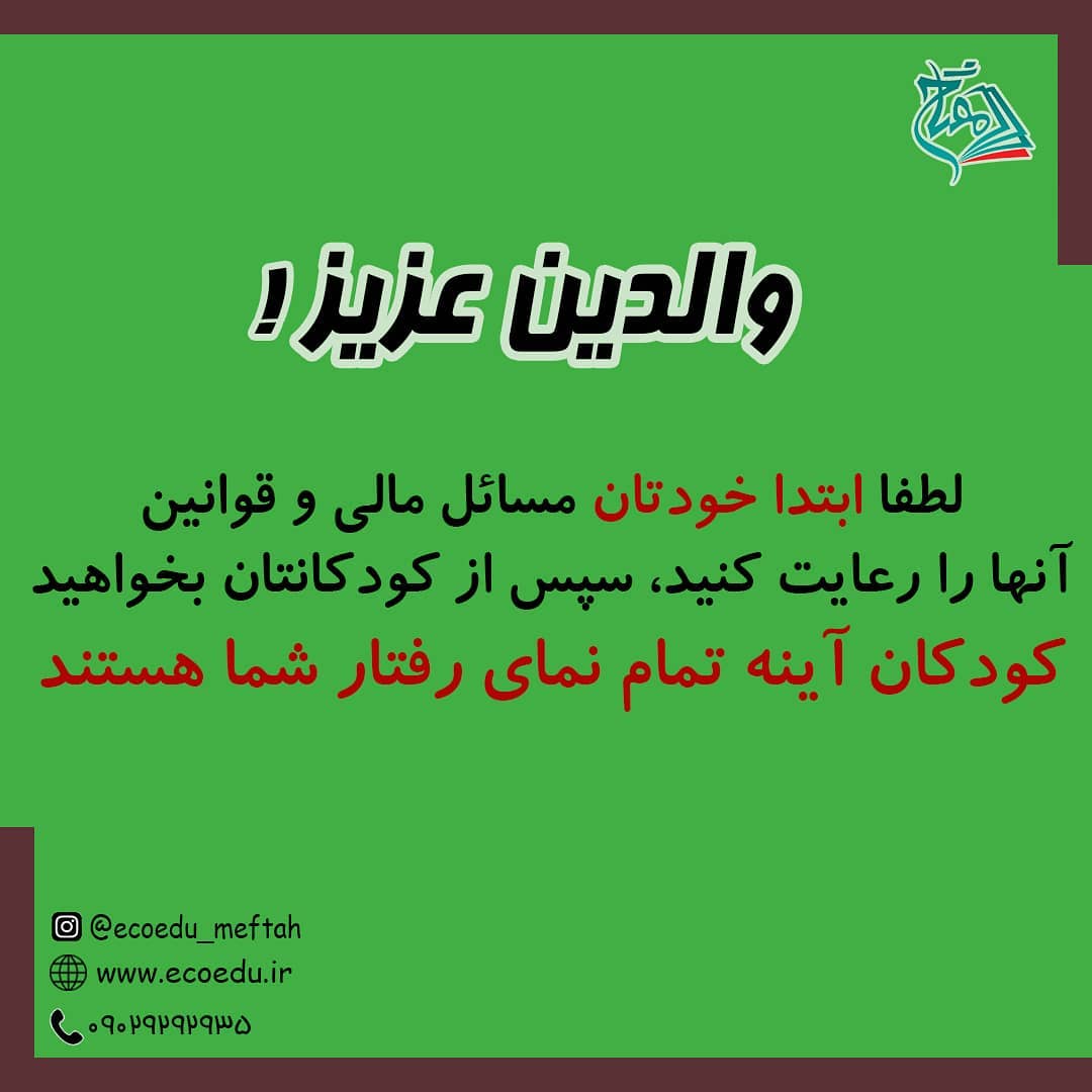 🚩 لطفا این پست رو فقط نخونید و رد بشید! . عمل کنید✋ . کودکان آینه تمام نمای رفتار شما در هر چیزی هستند و دقت کنید که رفتار های مالی از مهم ترین رفتارهاست! چیزی که هرگز از انها جدا نشده و نخواهد شد. . پس صحیح بیاموزید؛ صحیح آموزش دهید😊 . ارتباط با ما: 09029292935 . ◀مفتاح؛ موسسه فرهنگی هنری تربیت اقتصاد حکیم @ecoedu_meftah