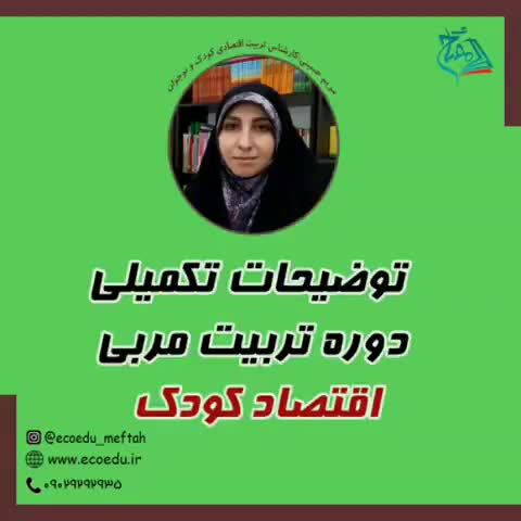 👉دوره تربیت مربی اقتصاد کودک👈 . اگر به حوزه تربیت اقتصادی و مالی کودک علاقه دارید این فیلم را تا انتها ببینید🌹 . 🎙سرکار خانم حسینی؛مدیر موسسه تربیت اقتصادی مفتاح و مدرس دوره . هر سوال یا ابهامی دارید کامنت کنید یا در دایرکت بپرسید. . مبلغ دوره: ۲۵۰هزارتومان . ✔۵ تا ۱۹ مرداد ماه ✔روزهای فرد ساعت ۲۱ تا ۲۲ ✔۶ وبینار یک ساعته(انلاین) و یک جلسه ارزشیابی ✔اعطای مدرک درصورت قبولی در ارزشیابی پایانی . جهت ثبت نام در دایرکت پیام داده یا از ساعت ۱۰ صبح تا ۴ بعد از ظهر با شماره تلفن زیر تماس بگیرید یا پیام بدهید 090 29 29 29 35 . ◀مفتاح؛موسسه فرهنگی هنری تربیت اقتصاد حکیم @ecoedu_meftah