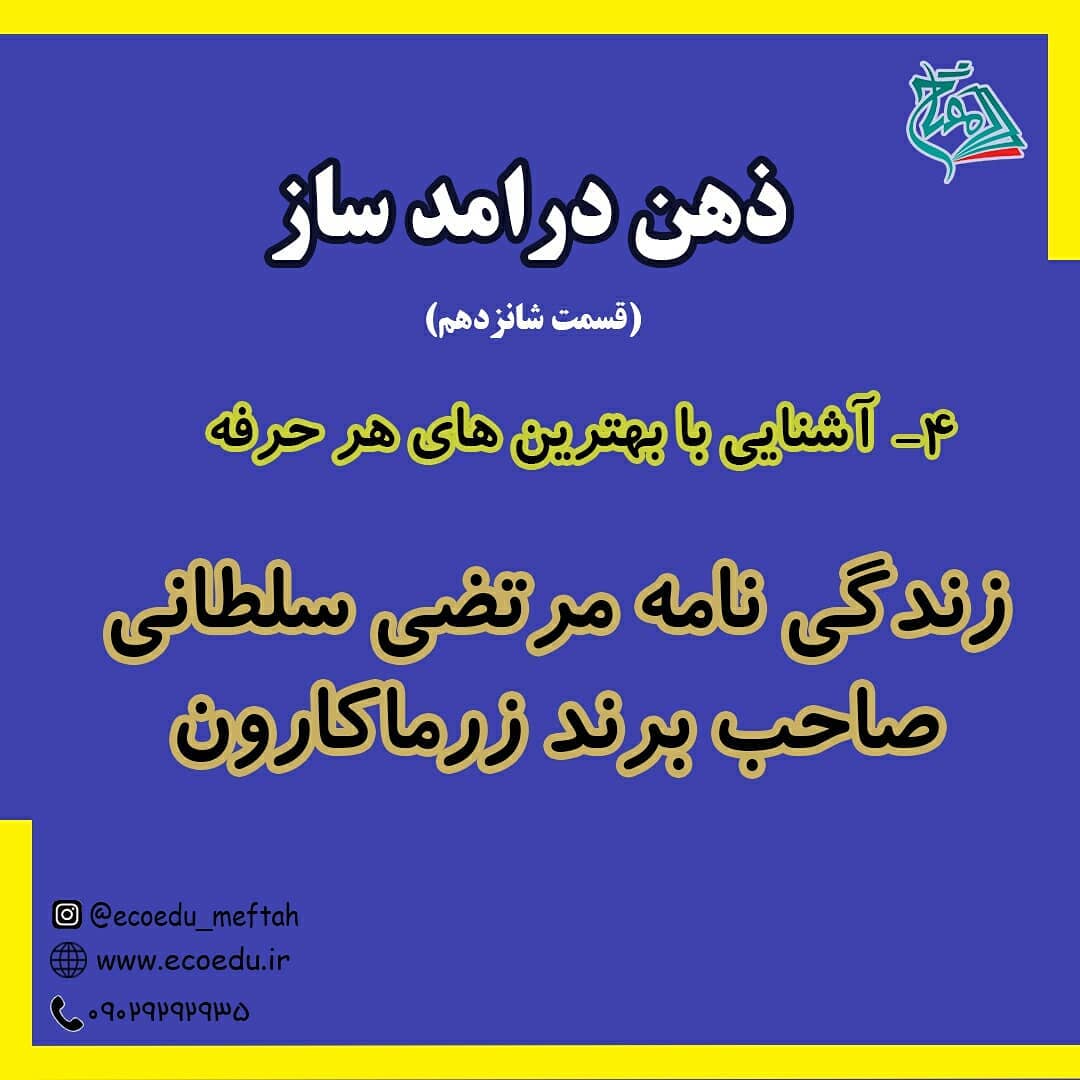 😊 فرزندانتان را با زندگی افراد برتر آشنا کنید . ✔این پست رو تا اخر بخونید و درس های مهم زندگی صاحب برند زرماکارون رو با خودتون مرور کنید. واقعا خوندنی و عالیه😍😍👌 . ☡شما چقدر این رفتار ها رو مهم میدونید؟ ☡تاحالا برای خودتون یا فرزندانتون انجام دادید؟ . (این صحبت ها خلاصه شده ی صحبت های اقای مرتضی سلطانی هست) . اگر این پست مفید بود برای سایرین هم ارسال کنید😊😊 . #اقتصاد_را_از_کودکی_فرهنگ_سازی_کنیم🌸 ◀مفتاح؛موسسه فرهنگی هنری تربیت اقتصاد حکیم @ecoedu_meftah @ecoedu_meftah @ecoedu_meftah #کارافرین#کارافرینی#کارفرین_برتر#زرماکارون#شغل#تربیت_صحیح_کودکان #تربیت_اقتصادی_کودکان #تربیت_مالی_کودکان#سواد_مالی_کودک#سواد_مالی_نوجوان#سواد_مالی_خانواده#موسسه_فرهنگی_تربیت_اقتصاد_حکیم #مفتاح_حکیم #مفتاح