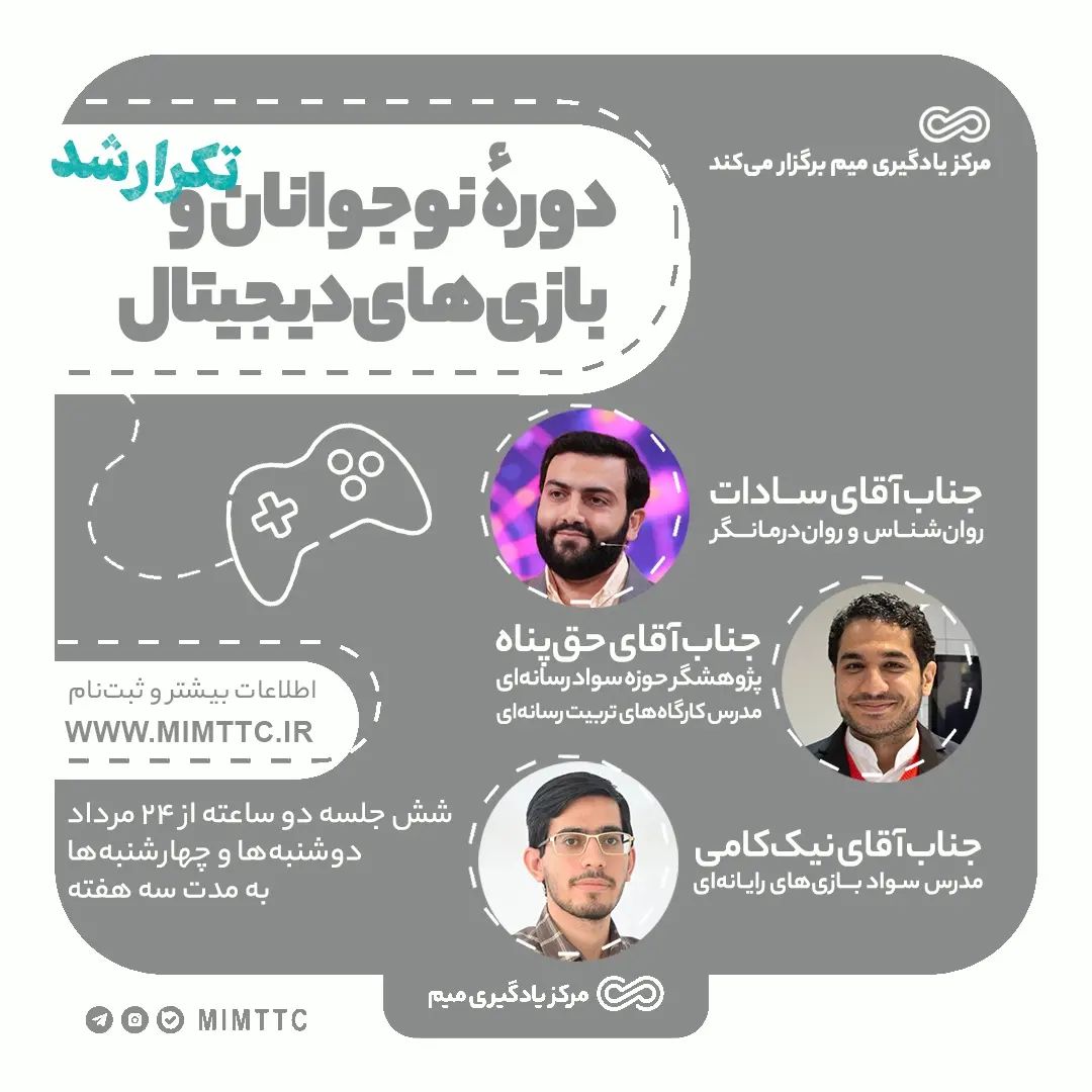 . حتما شما هم به عنوان پدر و مادری که بچههاشون با دنیای دیجیتال درگیرن، به این فکر کردین که بازیهای دیجیتالی نوجوونها چه تأثیری روی اونها میذاره؟ 📱 یا مثلا به این فکر کردین که اگه فرزندتون داره بازیای انجام میده که از نظر شما مشکل داره، چطوری میتونین باهاش در این مورد صحبت کنین و حتی توی مصرف رسانهایش مداخله کنین؟🤷 اینها سؤالاتی هستن که ممکنه ذهن هر پدر و مادری که فرزند نوجوون دارن رو به خودش مشغول کنه. به همین خاطر ما توی دورهٔ نوجوان و بازیهای دیجیتال، قصد داریم که به همین سؤالها جواب بدیم و مواجهه با دنیای پر چالش نوجوونها رو سادهتر کنیم.🙂 پس اگر دغدغهٔ نوجوونها و مصرف رسانهایشون رو دارین این دوره رو از دست ندین.👌 . برای ثبتنام توی این دوره فقط کافیه به سایت mimttc.ir سر بزنین یا از طریق دایرکت با ما در ارتباط باشین یا حتی میتونین از طریق لینک ثبتنام که توی استوری قرار داره، توی این دوره ثبتنام کنین.😌 #دیجیتال #اینترنت #موبایل #اعتیاد#مرکز_یادگیری_میم #مادر #پدر #نوجوان #نوجوانی #رسانه #سواد_رسانه_ای #دوره #بازی #بازی_دیجیتال #بازی_رایانه_ای #والد #والدگری #والدین #تربیت