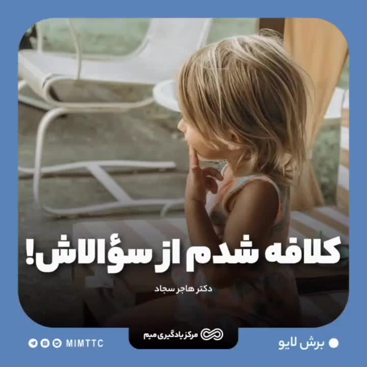 . به نظرتون چرا بچهها انقد سؤال میپرسن؟ 🙄 . و چرا انقد پشت سر هم سؤال میپرسن؟🤔 . و چرا هیچ وقت هیچ پاسخی قانعشون نمیکنه و همیشه یه سؤال بعدی برای غافلگیر کردن ما دارن؟ 🥴 . توی این برش لایو که بخشی از لایو کنجکاوی و زیاد سؤال پرسیدن بچههاست، خانم دکتر هاجر سجاد برامون از دلایل زیاد سؤال پرسیدن بچهها گفتن. 😌 . شما هم این مسئله رو دارین؟ باهاش چیکار میکنین؟🧐 . #کنجکاوی_بچه_ها #کنجکاوی #کودک #تربیت_فرزند #کودک_مستقل #کودکی #والدگری #فرزند_پروری #میم #مرکز_یادگیری_میم