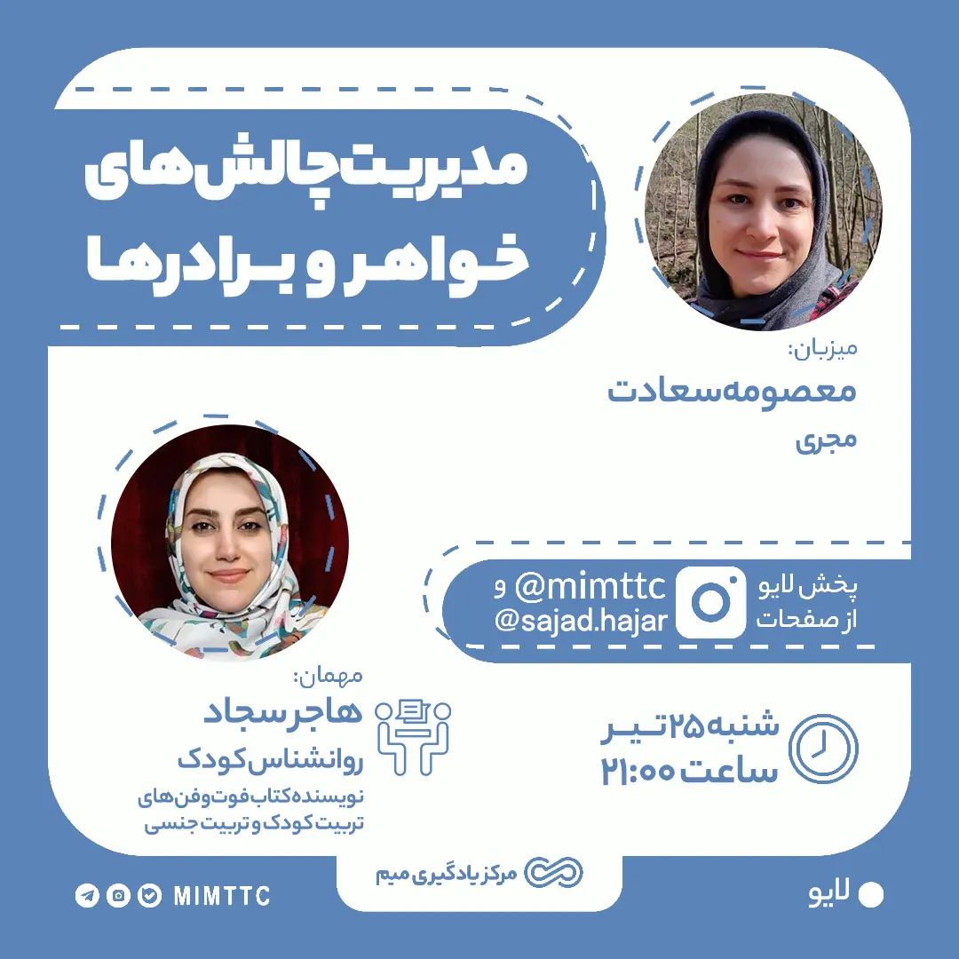 . اگه مامانِ دو یا چندتا فرزند هستین؛ بیشک با چالشهای خواهر و برداری بینشون زیاد مواجه شدین🤷 دعوا کردنشون سر اسباببازی یا جای خواب، ریاستطلبی فرزندان کوچیکتر و حسادت فرزندان بزرگتر...خلاصه ممکنه چالشهای مختلفی از این دست براتون پیش اومده و نمیدونستین که باید چطور مدیریتش کنین🥴 ما توی لایو امشب (شنبه ۲۵ تیرماه، ساعت ۲۱) که قراره با خانم سجاد بزرگوار، روانشناس کودک داشته باشیم؛ میخوایم در مورد مدیریت این چالشهای خواهر و برادری صحبت کنیم. . #لایو #تربیت #تربیت_کودک #دعوا #دعوای_بچه_ها #روانشناسی_کودک #روانشناسی #حسادت_بین_فرزندان #چالش_خواهر_برادری #والدگری #والدین #میم #مرکز_یادگیری_میم